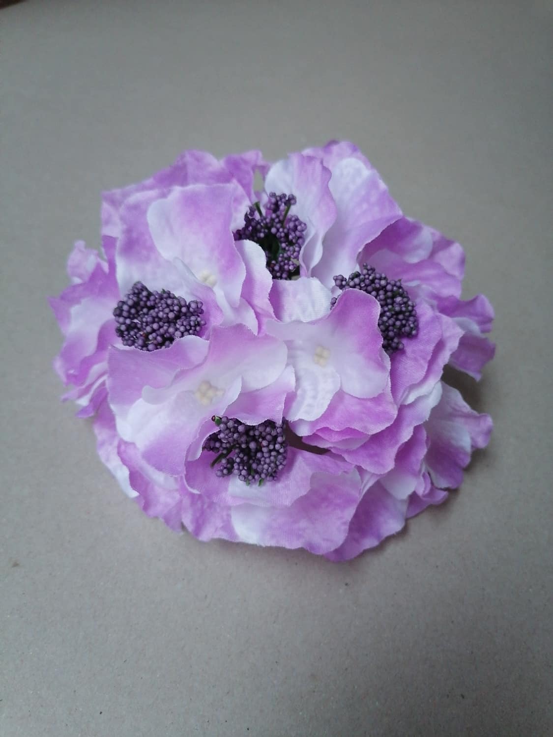 Kvet hortenzie, veľký a dekoratívny. Kvalitné spracovanie a materiál (satén). Priemer 15-16 cm, výška 8 cm.