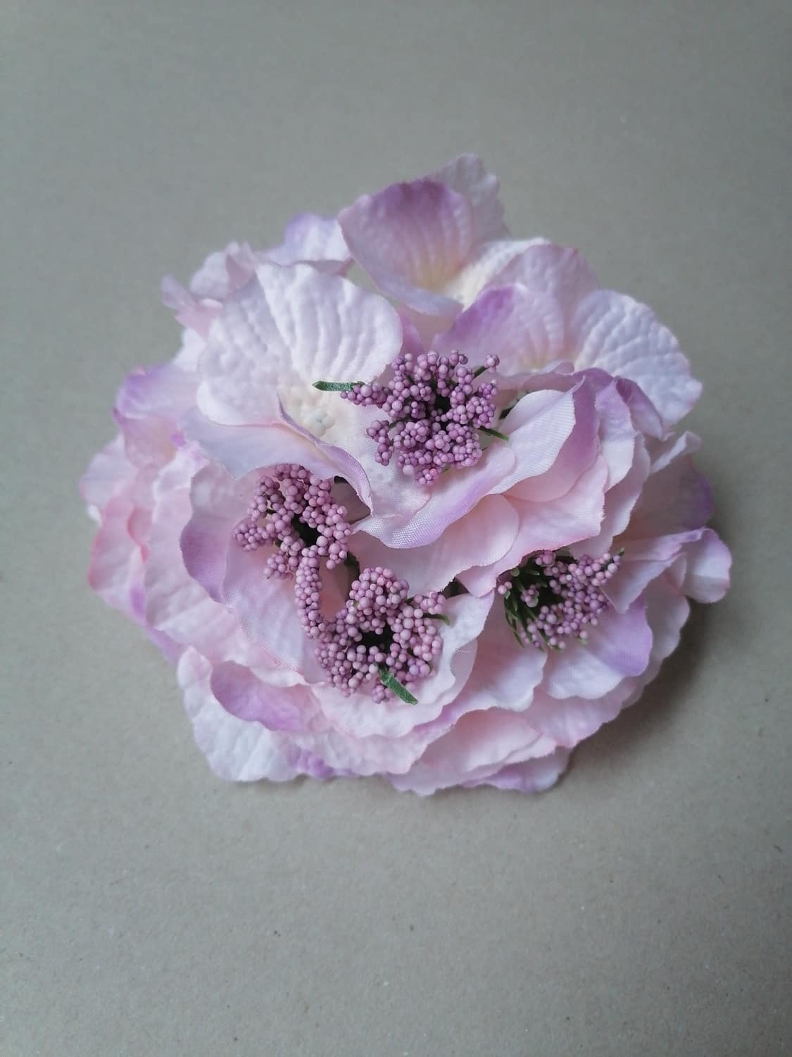 Kvet hortenzie, veľký a dekoratívny. Kvalitné spracovanie a materiál (satén). Priemer 15-16 cm, výška 8 cm.