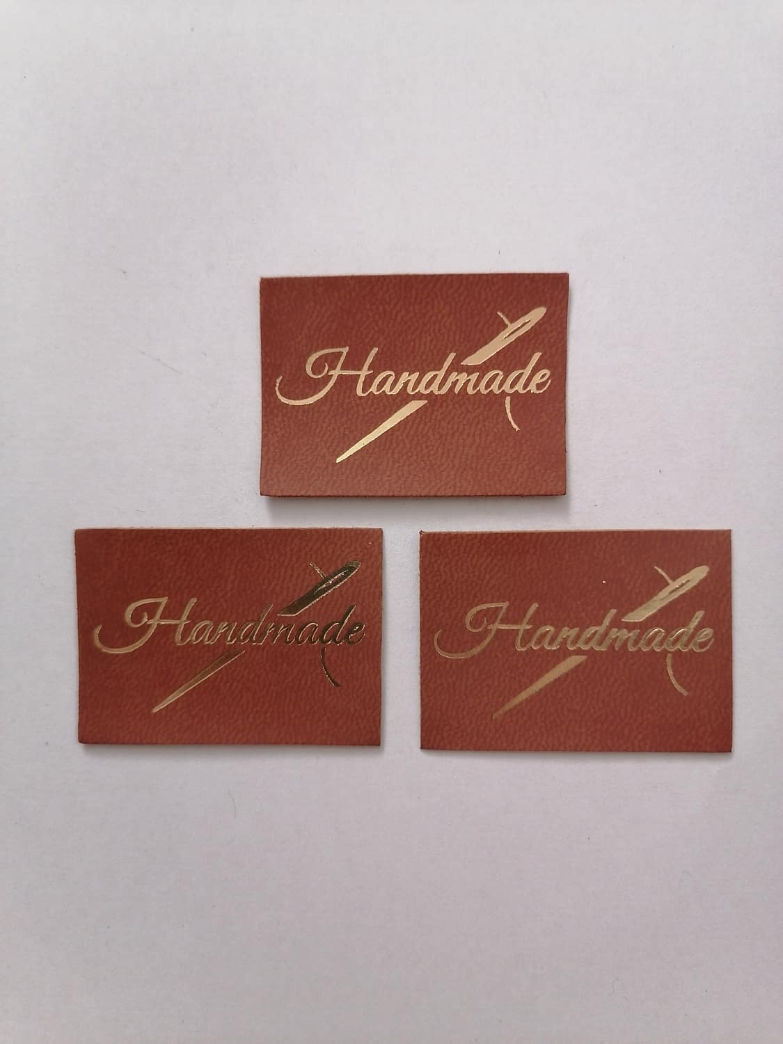- Štítok Ekokoža 4,5x3,2cm Handmade so zlatou ihlou - hnedý