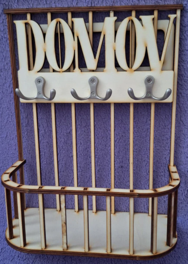 Dekoračný kôš na kľúče. Kôš je vyrobený z 5mm preglejky. Súčasťou dodávky je nápis DOMOV, tri kusy vešiakov na klúče, zadná časť na uchytenie a zavesenie. Výška zadnej steny košíku je 28cm, šírka 20cm, šírka dolu 10cm, výška vpredu 7cm.