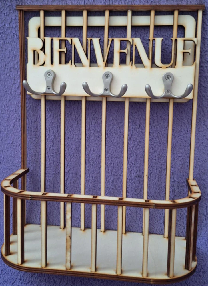 Dekoračný kôš na kľúče. Kôš je vyrobený z 5mm preglejky. Súčasťou dodávky je nápis VITAJTE (po francúzky), tri kusy vešiakov na klúče, zadná časť na uchytenie a zavesenie. Výška zadnej steny košíku je 28cm, šírka 20cm, šírka dolu 10cm, výška vpredu 7cm.