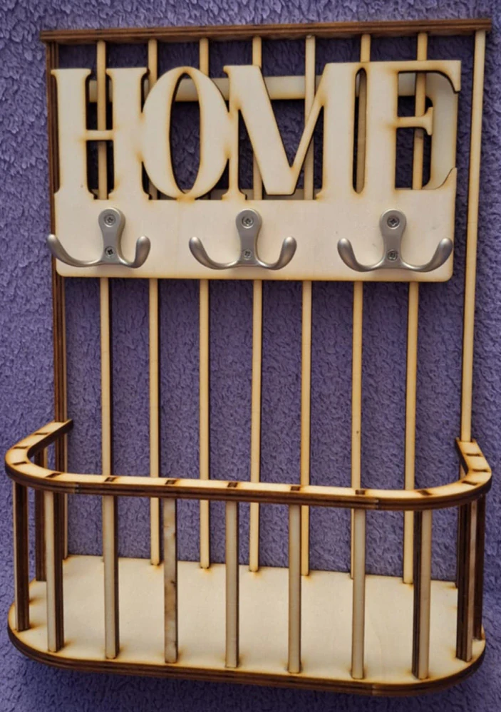 Dekoračný kôš na kľúče. Kôš je vyrobený z 5mm preglejky. Súčasťou dodávky je nápis HOME, tri kusy vešiakov na klúče, zadná časť na uchytenie a zavesenie. Výška zadnej steny košíku je 28cm, šírka 20cm, šírka dolu 10cm, výška vpredu 7cm.