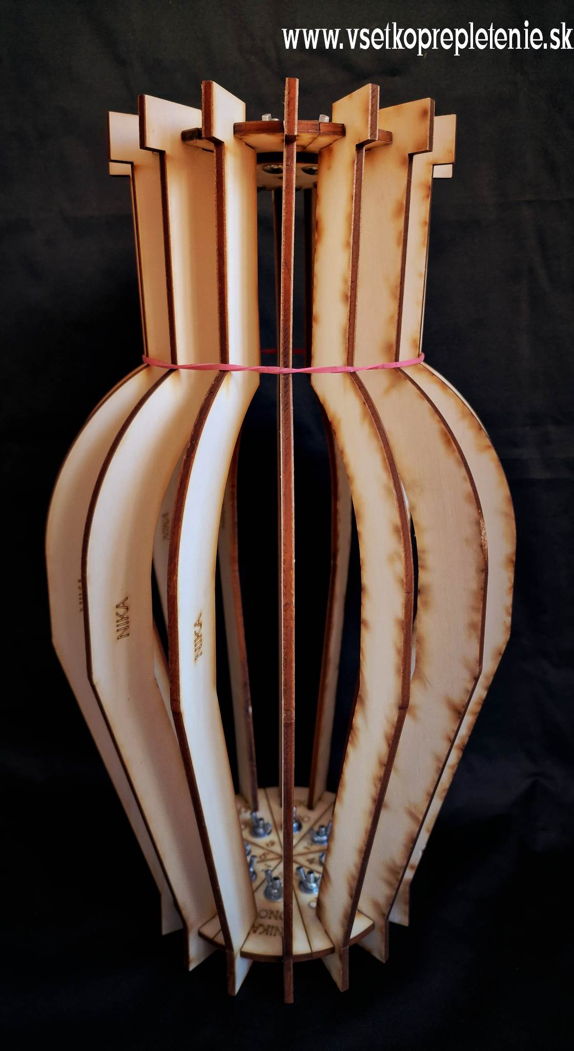 Forma na pletenie Nika, má základý kruhový tvar o priemere 25cm. Šírka v strede lamely je 34cm. Hrdlo karafy má šírku 15cm.Táto forma môže slúžiť ako krásna dekorácia so živými kvetmi, umelými dekoráciami. Výška formy v najvyšom bode je 45cm .