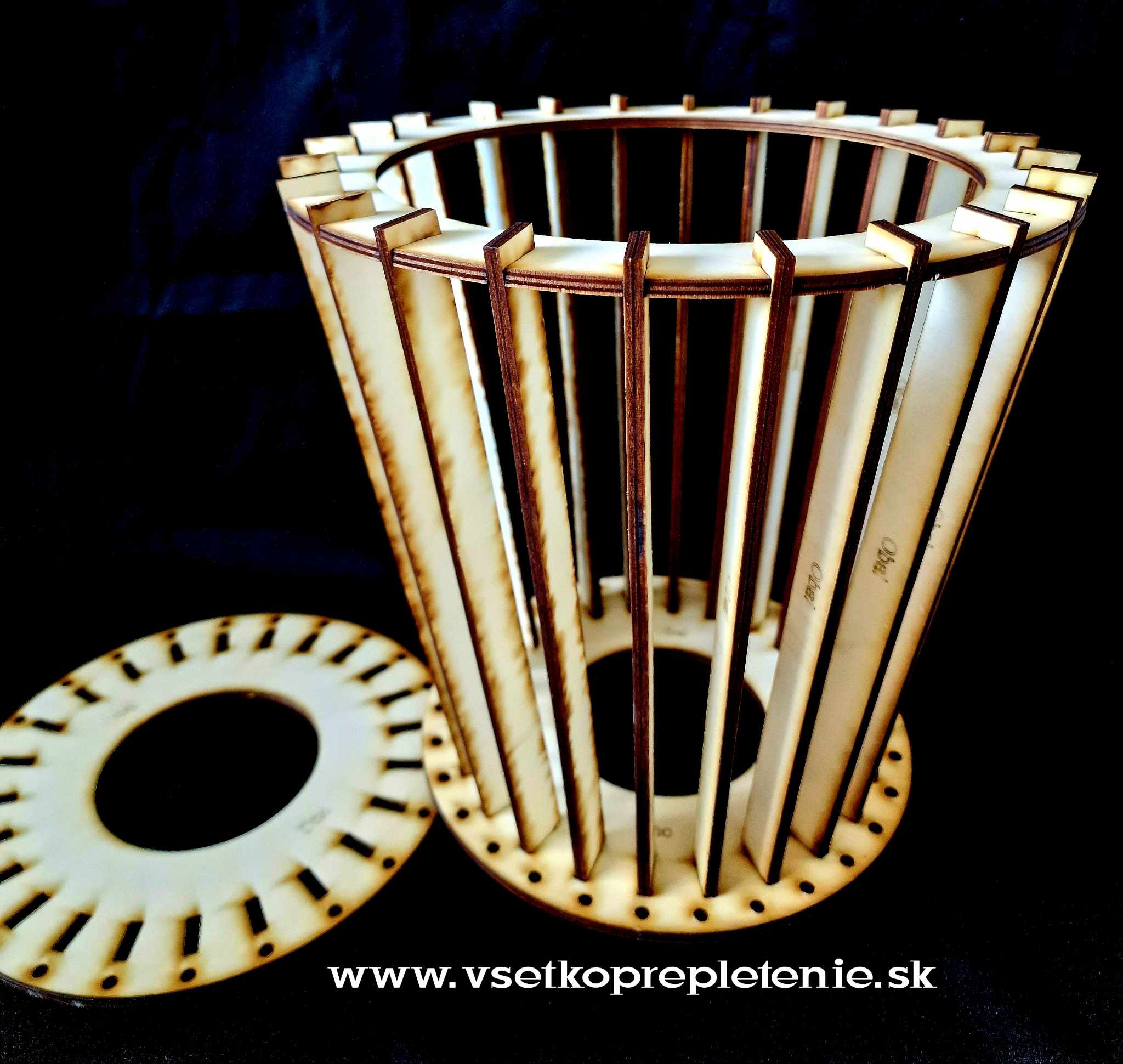 Forma na pletenie Obal, má základý kruhový tvar o priemere 20cm. Hrdlo formy má šírku 30cm. Forma je konštruovaná tak, že môže opletať formu na kvetináč aby ste si urobili uzávierku hore aj dolu. Dolu máte nachystané dierky na 30 alebo 24 osnovných ruličiek kto ako chce husté pletenie. Táto forma môže slúžiť ako obal na kvetináče alebo dekorácia do interieru. Výška formy v najvyšom bode je 30cm ale môžete si ju obaliť kartonom a upliesť si vyšší obal..