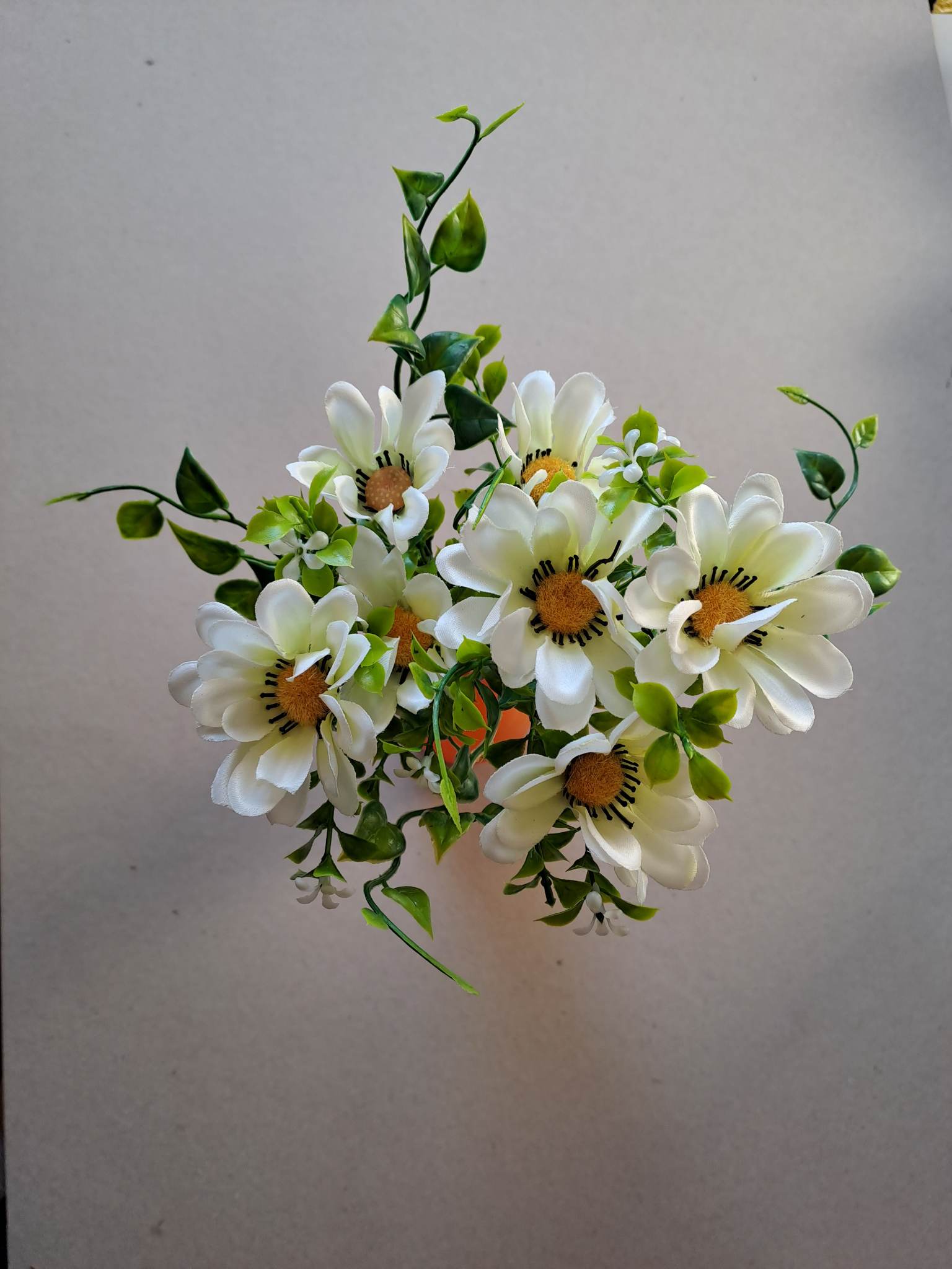 Harmančekova kytica s plastovými listami. Kvety sú saténové. Celková výška kytice je 30 cm, kytica má 7 vetiev.