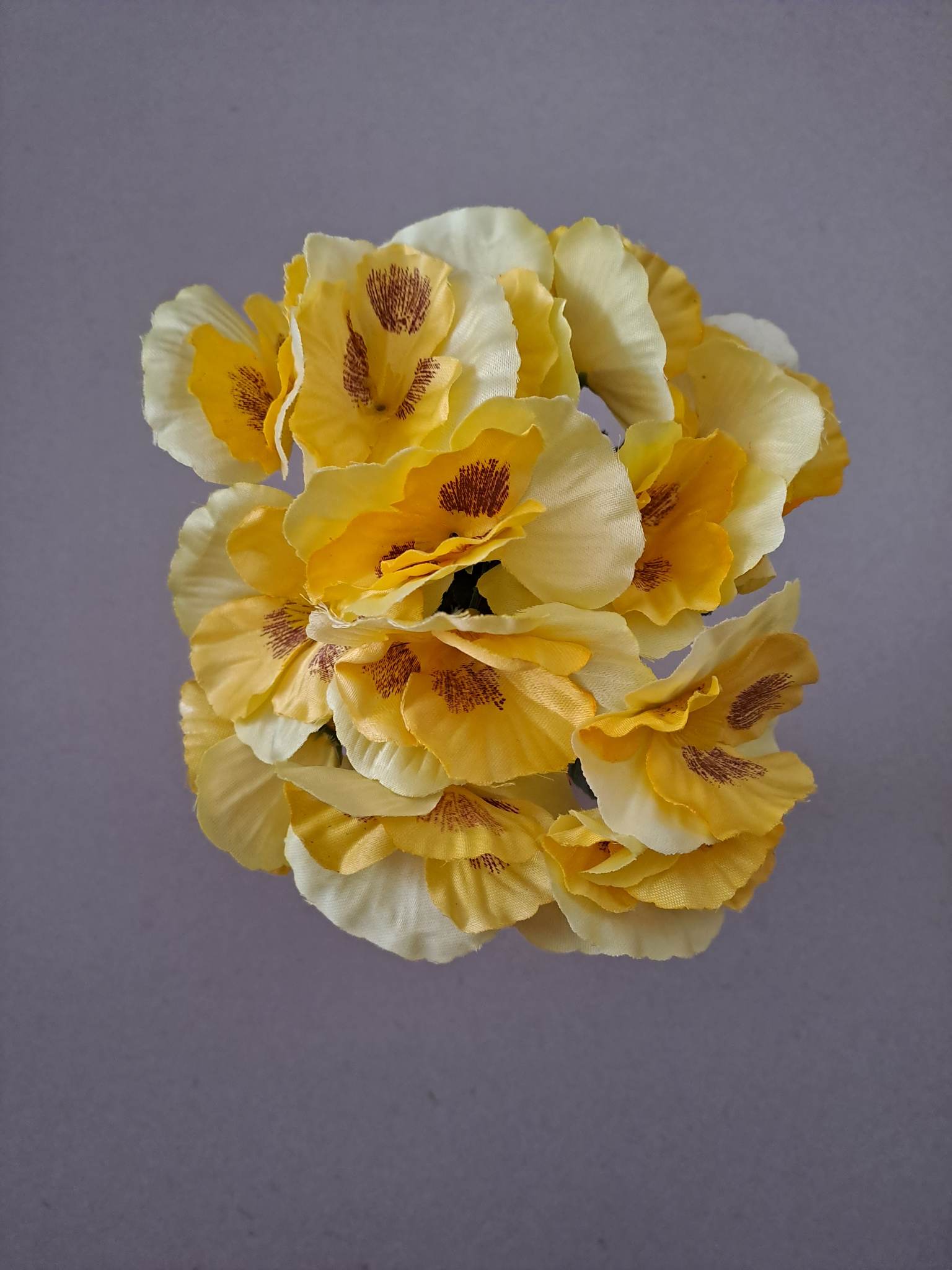 Veľmi pekné kytice macešky. Kvety vyrobené zo saténu, kytička má 7 vetvičiek. Živé, pekné farby. Výška kytice je 24 cm.