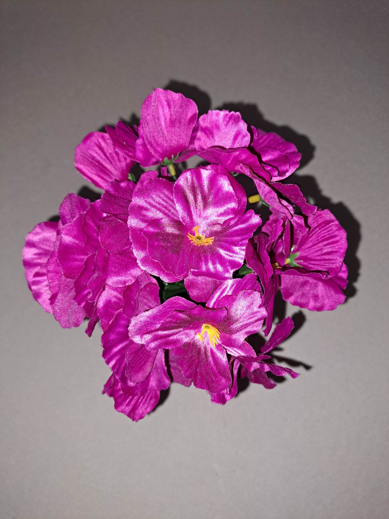 Veľmi pekné kytice macešky. Kvety vyrobené zo saténu, kytička má 7 vetvičiek. Živé, pekné farby. Výška kytice je 24 cm.