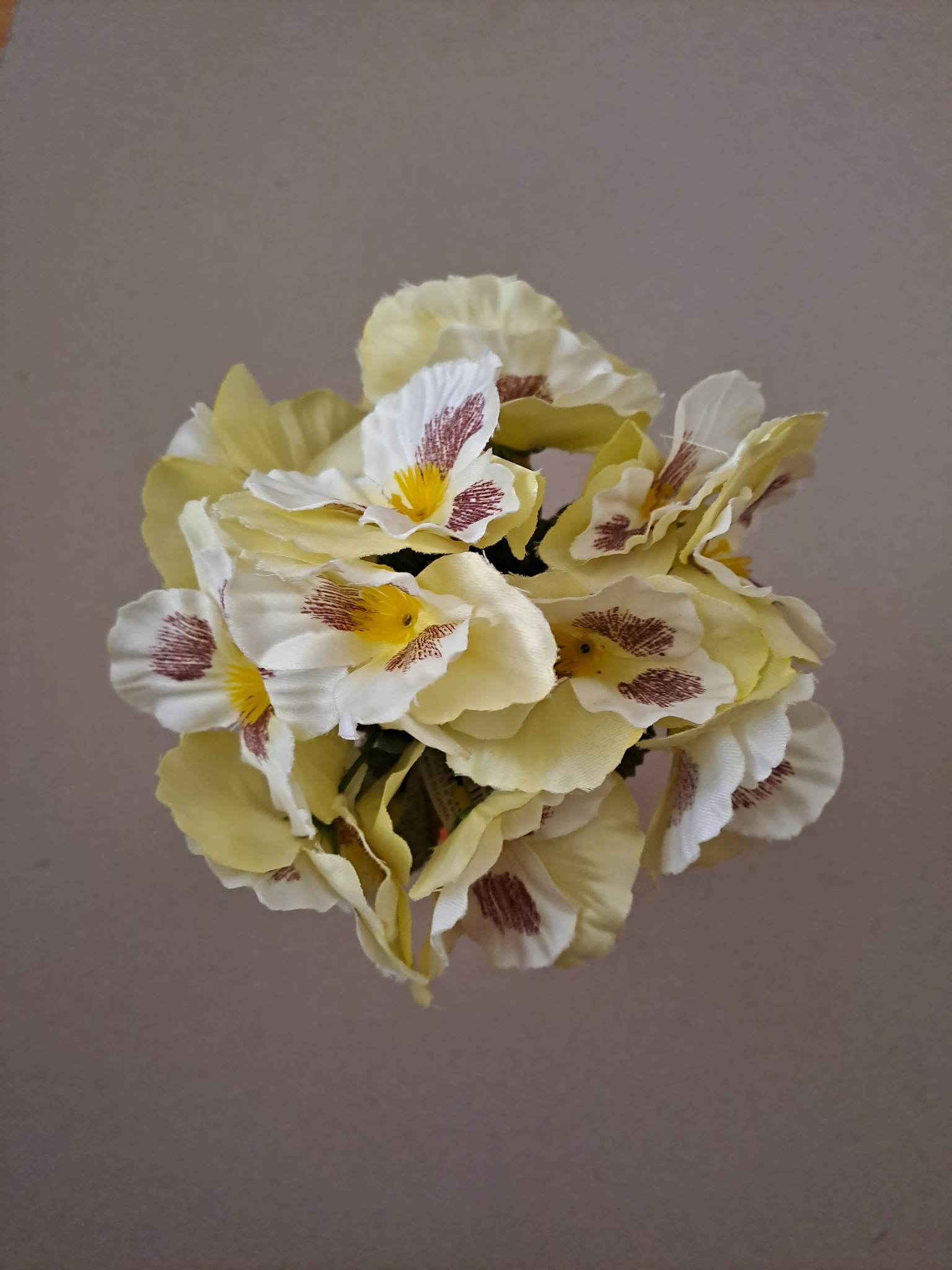 Veľmi pekné kytice macešky. Kvety vyrobené zo saténu, kytička má 7 vetvičiek. Živé, pekné farby. Výška kytice je 24 cm.