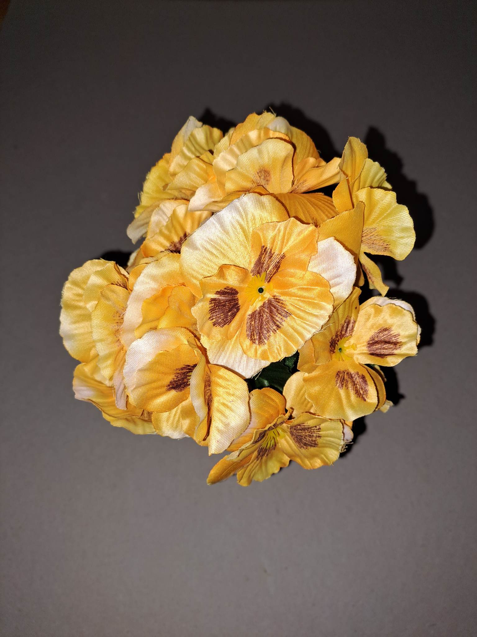 Veľmi pekné kytice macešky. Kvety vyrobené zo saténu, kytička má 7 vetvičiek. Živé, pekné farby. Výška kytice je 24 cm.