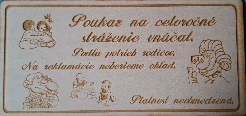 Poukaz na stráženie vnúčat, je pekný humorný darček pod vianočný stromček. Text je možné upraviť podľa Vašich predstáv.