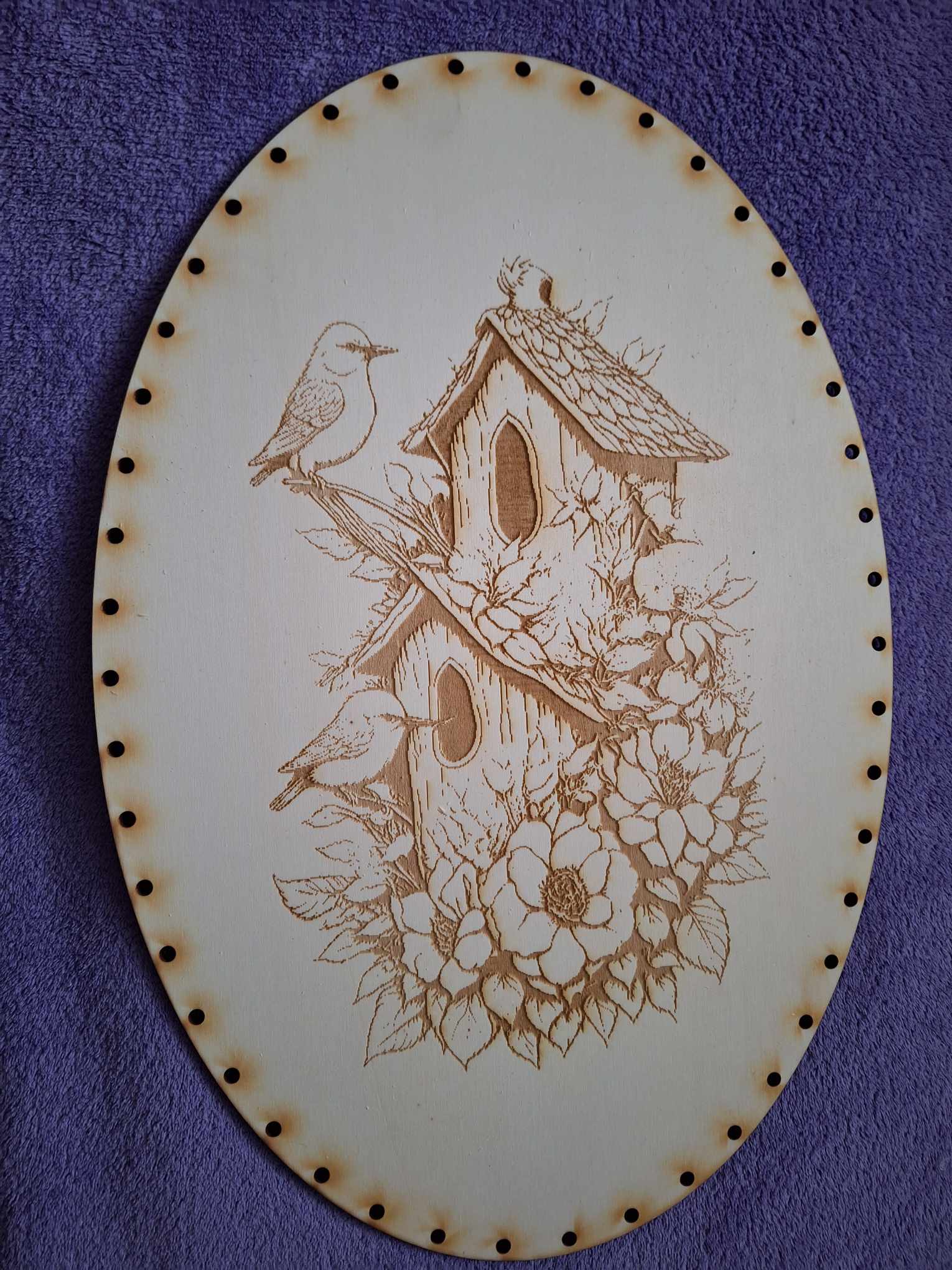 Preglejkové dno gravírované elipsa 3mm - 23x17cm Vtáci s búdkou
