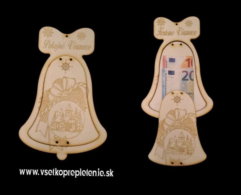 Krásny dekoračný zvon pre darovanie peňazí pod stromček. Rozmer zvonu je 23x15cm. Dodávaný je v surovom stave pre možnosť si doma dodekorovať podla svojich predstáv. Na zvone je dierka na zavesenie na stromček.