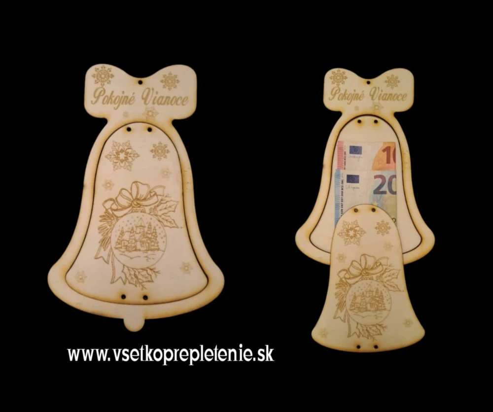 Krásny dekoračný zvon pre darovanie peňazí pod stromček. Rozmer zvonu je 23x15cm. Dodávaný je v surovom stave pre možnosť si doma dodekorovať podla svojich predstáv. Na zvone je dierka na zavesenie na stromček.