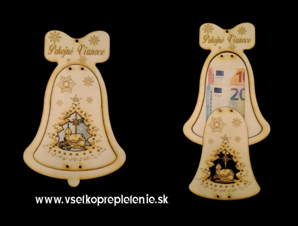 Krásny dekoračný zvon pre darovanie peňazí pod stromček. Rozmer zvonu je 23x15cm. Dodávaný je v surovom stave pre možnosť si doma dodekorovať podla svojich predstáv. Na zvone je dierka na zavesenie na stromček.