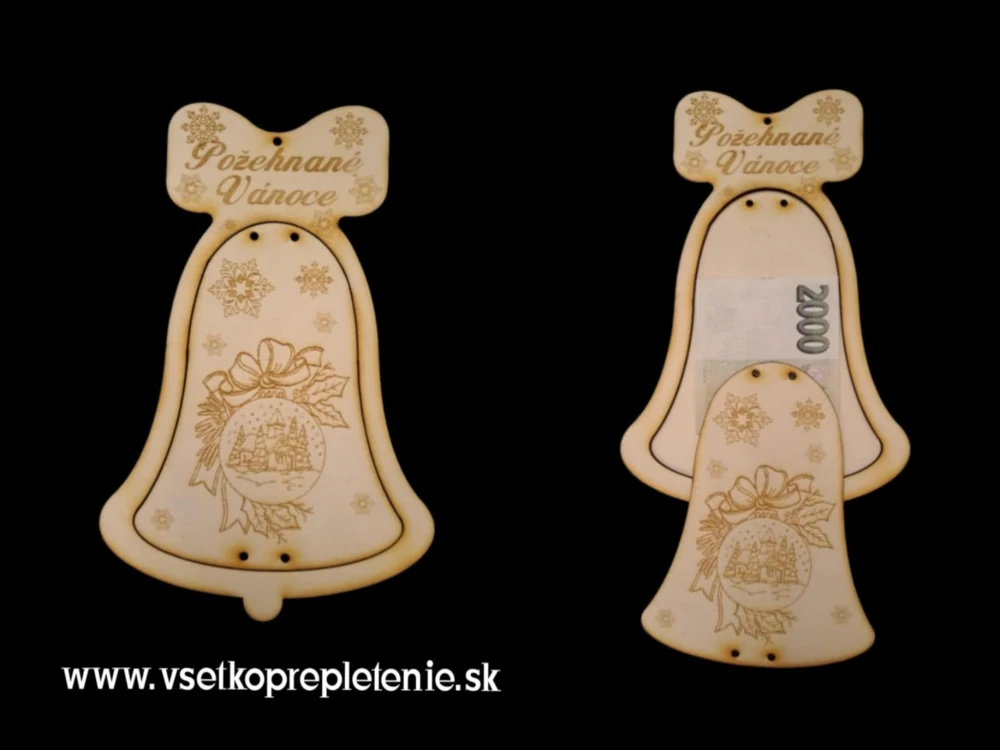 Krásny dekoračný zvon pre darovanie peňazí pod stromček. Rozmer zvonu je 23x15cm. Dodávaný je v surovom stave pre možnosť si doma dodekorovať podla svojich predstáv. Na zvone je dierka na zavesenie na stromček.