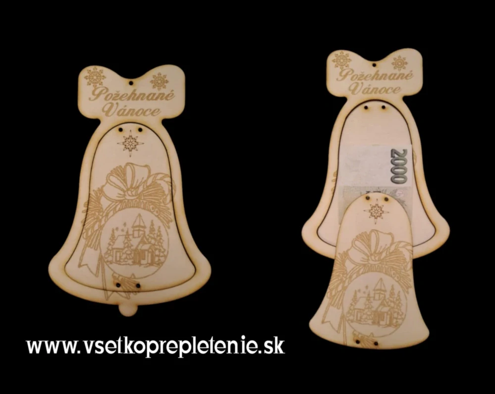 Krásny dekoračný zvon pre darovanie peňazí pod stromček. Rozmer zvonu je 23x15cm. Dodávaný je v surovom stave pre možnosť si doma dodekorovať podla svojich predstáv. Na zvone je dierka na zavesenie na stromček.
