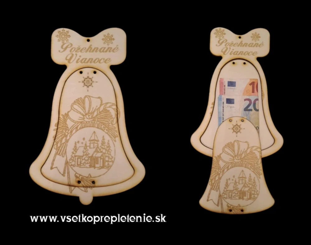 Krásny dekoračný zvon pre darovanie peňazí pod stromček. Rozmer zvonu je 23x15cm. Dodávaný je v surovom stave pre možnosť si doma dodekorovať podla svojich predstáv. Na zvone je dierka na zavesenie na stromček.