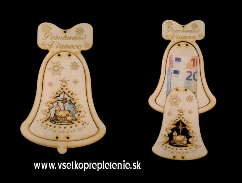 Krásny dekoračný zvon pre darovanie peňazí pod stromček. Rozmer zvonu je 23x15cm. Dodávaný je v surovom stave pre možnosť si doma dodekorovať podla svojich predstáv. Na zvone je dierka na zavesenie na stromček.